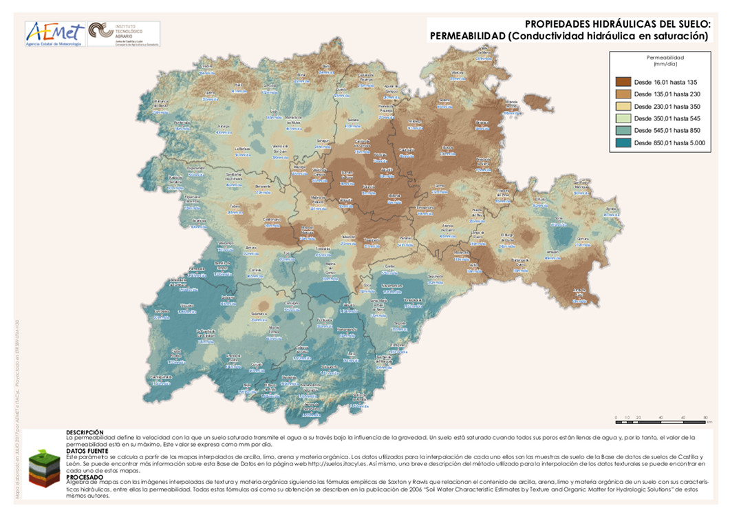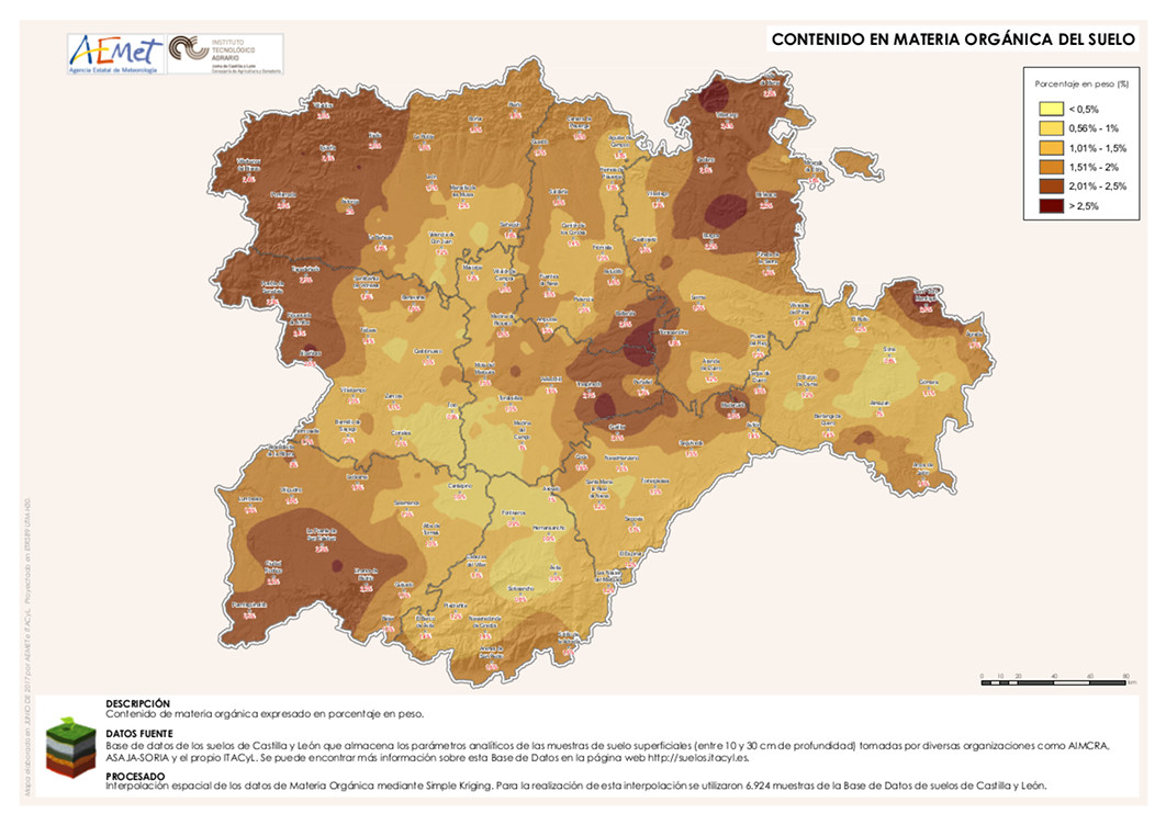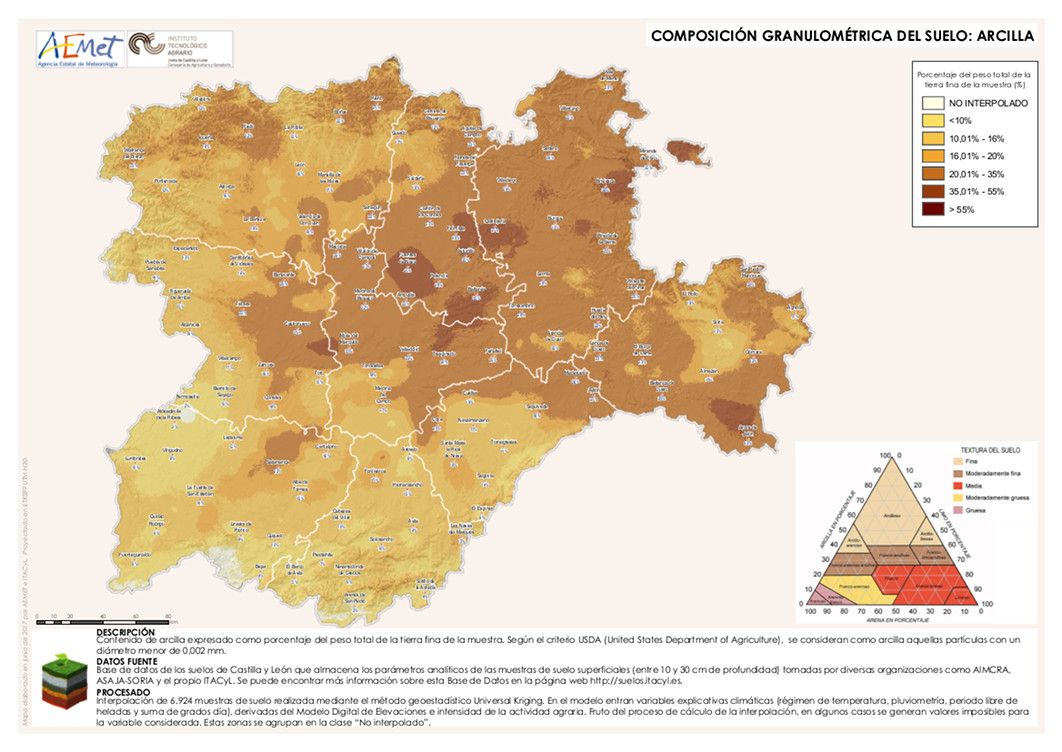 Las muestras de la Base de Datos de los Suelos de Castilla y León son heterogéneas. No en todas se han analizado los mismos parámetros en el laboratorio, pero lo que sí sucede es que para la mayor parte se conocen los porcentajes de arena, limo, arcilla y materia orgánica. Esta circunstancia ha permitido realizar interpolaciones aplicando métodos geoestadísticos y obtener imágenes ráster continuas de todo el territorio, en las que se puede consultar el valor de los parámetros interpolados. Así mismo se han podido utilizar los mapas interpolados de materia orgánica, arena, limo y arcilla para, mediante álgebra de mapas, calcular diversas propiedades hidráulicas del suelo a partir de las fórmulas de Saxton y Rawls. A continuación se puede ver un mapa temático de cada una de las variables (clicando sobre la imagen) y se puede descargar el fichero resultante del procesado espacial clicando sobre el título del mapa.