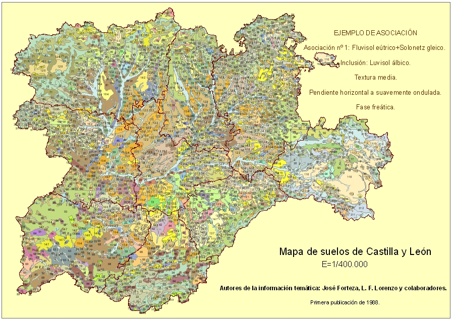 Es un mapa escala 1/400.000 y clasificación FAO. Este mapa fue publicado en 1.988 (a escala 1/500.000) con la leyenda incompleta, ya que no recogía las asociaciones de suelos que establecieron los autores, J. Forteza Bonnin, L. F. Lorenzo Martín y colaboradores, para cada una de las unidades cartográficas. A principios del 2011, en el Centro de Información Territorial (CIT) de la Junta de Castilla y León se recuperó la versión digital de este mapa y en el Instituto de Recursos Naturales y Agrobiología de Salamanca (IRNASA-CSIC) se han modificado algunos de los calificadores de las asociaciones originales, para adaptarlos a los que utiliza la Base de Referencia Mundial para Recursos de Suelos (WRB 2006). En el ITACYL se ha reeditado este mapa: se ha asignado a cada tesela el identificador de la asociación correspondiente, se han fusionado polígonos que tenían el mismo identificador y se han corregido los errores topológicos. Se ha elaborado una leyenda para el mapa que se muestra en la sección VISOR, en base al gran Grupo de Suelo de Referencia (GSR) más el calificador correspondiente (segundo nivel en la estructura de la Base de Referencia Mundial para Recursos de Suelos-WRB) más frecuente o abundante en la asociación de suelos existente en la unidad cartográfica. Clicando sobre el título de este apartado, se puede descargar el fichero en formato vectorial de este mapa, la leyenda reelaborada por el IRNASA-CSIC, así como los mapas a escala 1/50.000 y 1/200.000 sobre los que trabajaron los autores para, con el pantógrafo, llegar al mapa 1/400.000 final.
